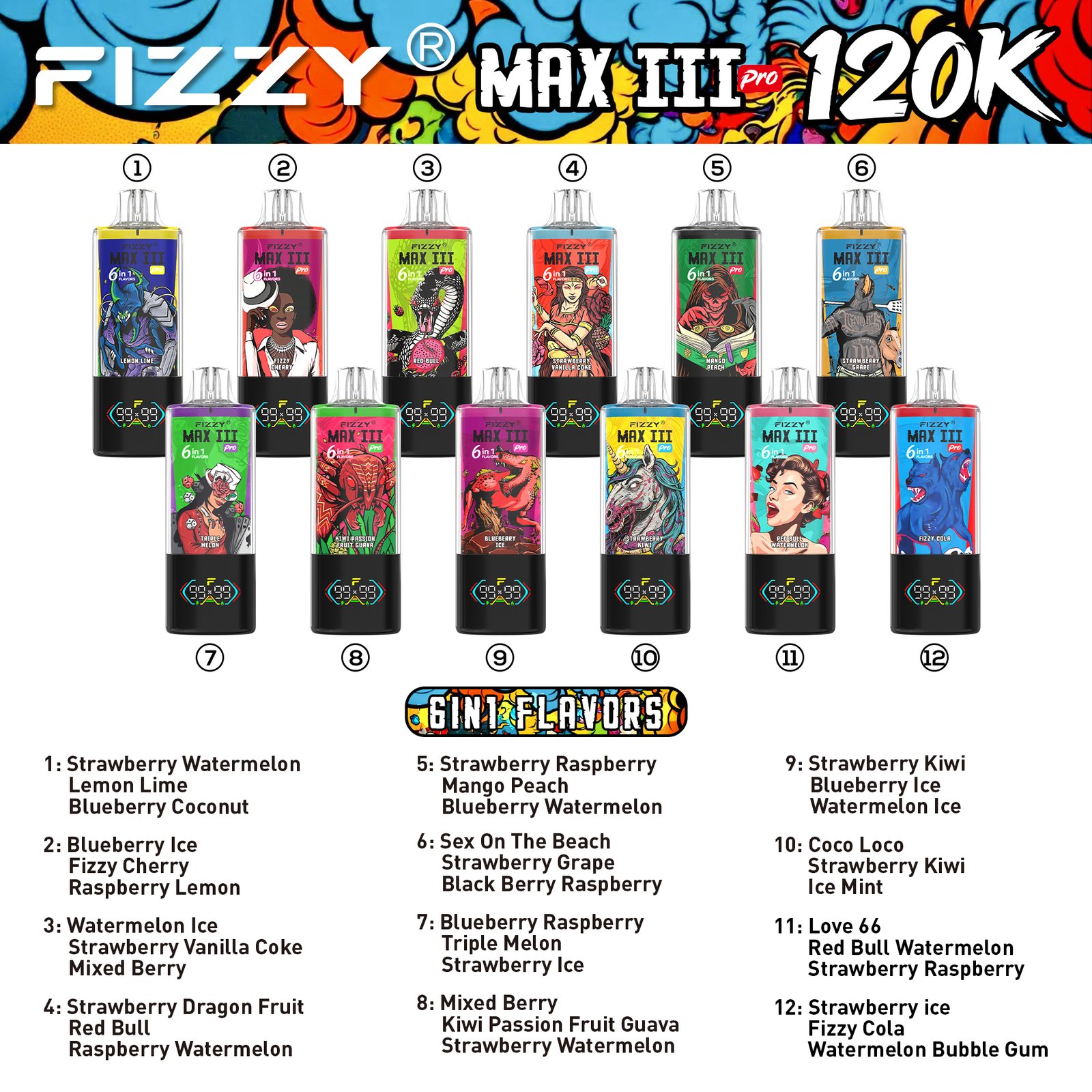 Fizzy Max III Pro 6in1 120K 120000 Puffs Disposable Vape Flavors List:
